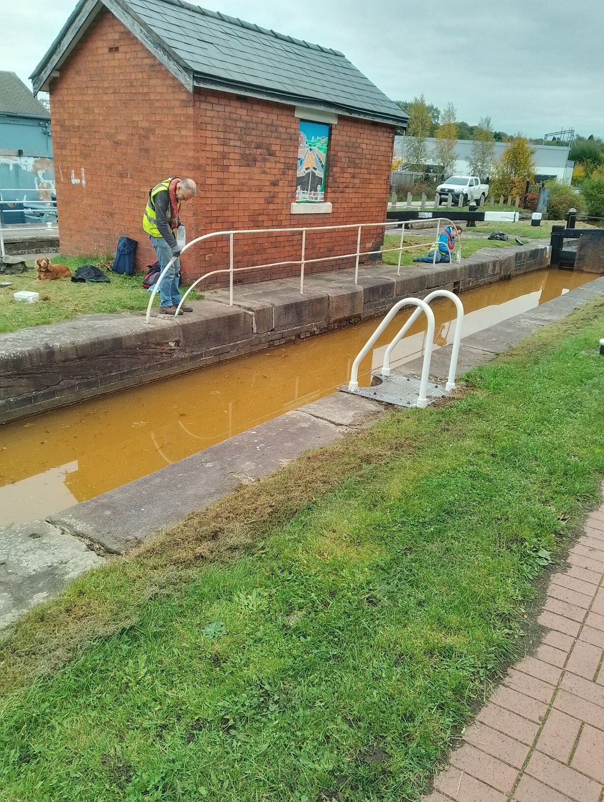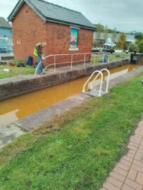 Thursday 16th October – Ideal weather conditions and the fact that the double lock was open to traffic at long last meant we were able to make excellent progress. We concentrated our efforts on the lock metalwork and surrounding fences/railings. There’s still plenty to be done including some woodwork but another good visit next month should mean the lock will be in a good state going into winter.